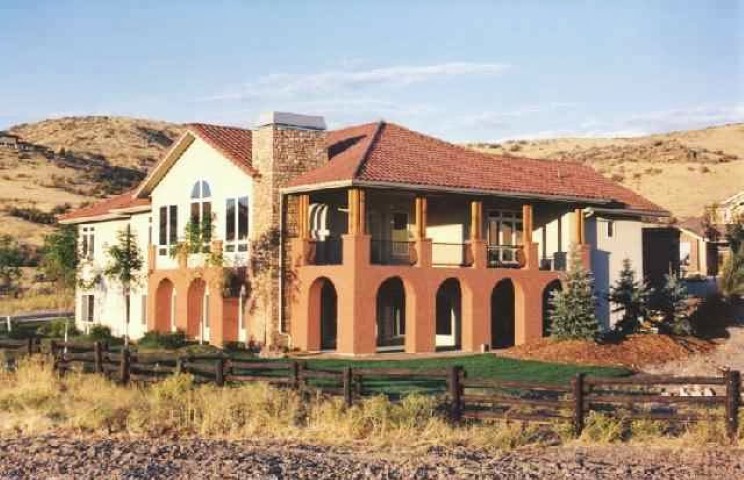 The Mediterranean style is distinguishable for its excessive use of arches and red tiled roofs. This house had large arches that support the second floor, which can also be seen from the outside. The windows have curved tops and even the walkway curves around like a 2-D arch. The doors on the side of the house facing the street are also in the shape of slight arches, and divided into rows and columns, as are many of the windows throughout the house. Another distinguishable feature of Mediterranean houses is the common use of iron railings for balconies, which can be found along the upper balcony adjacent to the main living space. The architect also focused on using large overhangs to help create shade from the sun during the summer. In contrast, the large windows facing the southern side take part in passive heating, where the sun shines through and warms the stone, which then helps to keep the house warmer during the colder months in the winter.