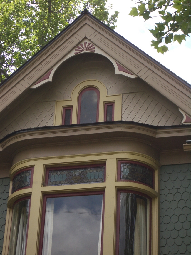 At the time of Gertrude’s original construction, the property owner was an exceedingly wealthy man and the effort to showcase that wealth led to the home’s intricate style and ornamentation. The building is officially documented as a Queen Anne, a subset of the broader Victorian styles. The detailed scalloped shingles, gables, and truncated hipped roof are characteristics of the style that can be found on Gertrude. The use of stained glass in the transoms and two-story bay window also follow the archetype of a Queen Anne home. There also used to be a turret on the west edge of the home, until a 1940s remodeling job when it was removed due to complications with the plumbing. Other than that and a few minor elements, the owners have successfully protected and retained most of Gertrude’s original design.