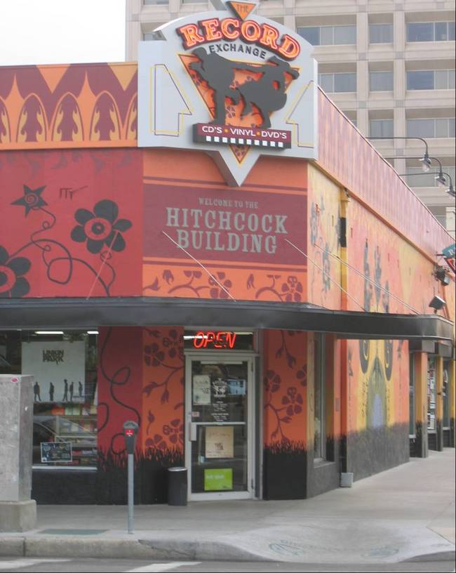 Today the building is most recognizable by the outside mural. The original mural went up over twenty years ago and depicted a street scene from early century Boise. It was designed and painted by Fred Choate. The new mural was dedicated in November of 2006, designed by the firm Oliver Russell, but yet again painted by Fred Choate. It was repainted to celebrate The Record Exchange’s 30th year in business. The Hitchcock building is an indispensible Art Deco landmark of the Boise Downtown.